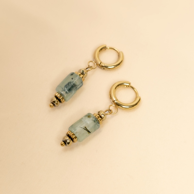 La mini créole épaisse doré, en acier inoxydable, met en valeur une pierre tube de phrénite, d’un vert translucide et apaisant, encadrées d’hématites dorées qui soulignent sa clarté naturelle.