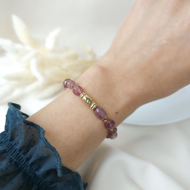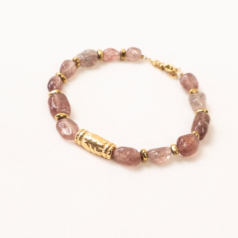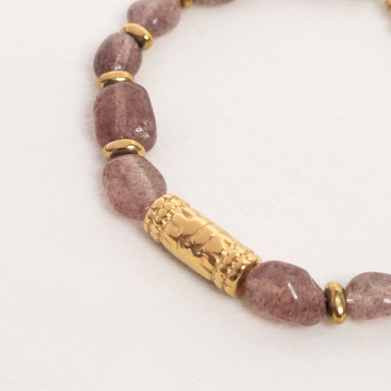 Des hématites dorées viennent ponctuer la composition, apportant éclat et structure. Au centre, une longue perle dorée en acier inoxydable, au design légèrement ethnique et texturé, devient le point focal du bracelet : une touche forte et élégante qui équilibre parfaitement la douceur du quartz rose.