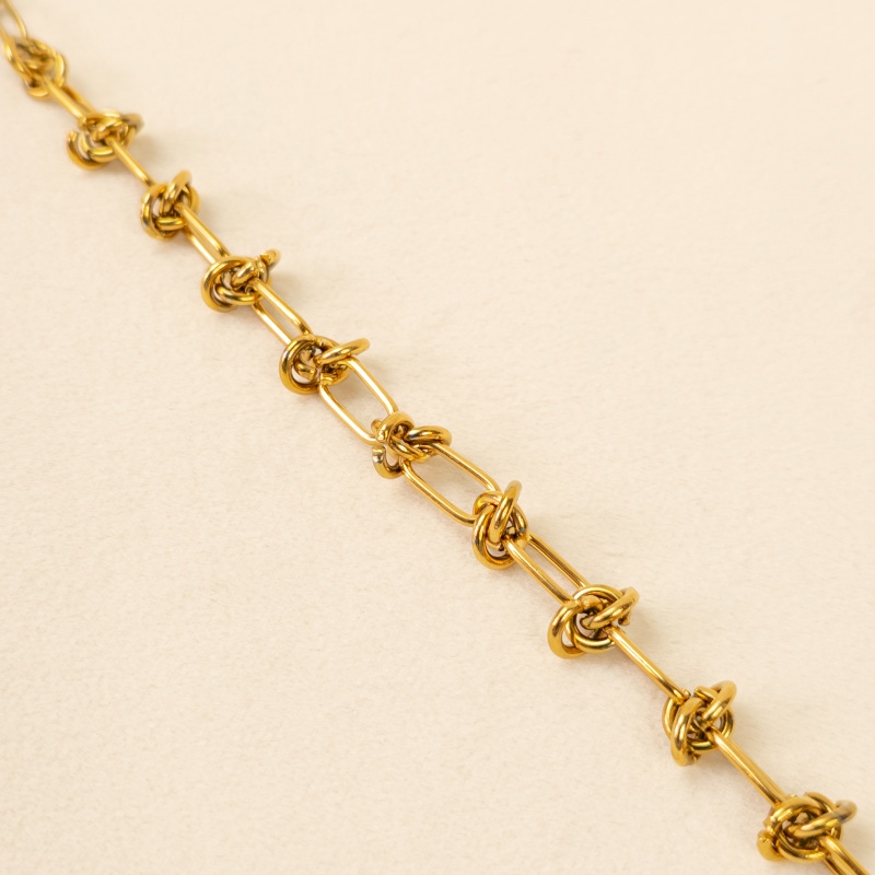 Le Anita est un bracelet au design affirmé et moderne, composé d’une chaîne dorée en acier inoxydable, caractérisée par ses maillons texturés et son effet nœud délicatement sculpté.