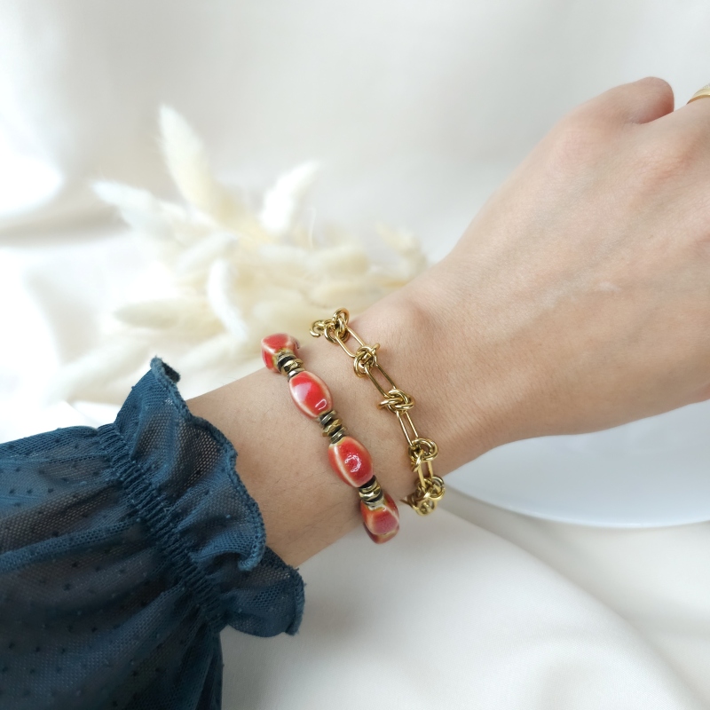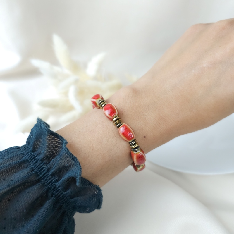 Le Frida rouge est un bracelet intense et chaleureux, composé de perles ovales en céramique aux nuances mêlant rouge profond et marbrures. Leur texture brillante et leur aspect artisanal donnent au bracelet une présence forte et expressive.