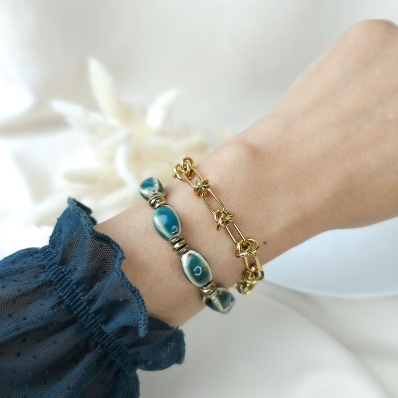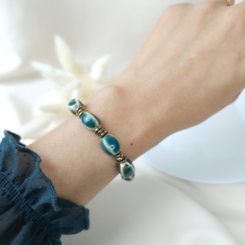 Le Frida vert est un bracelet lumineux et organique, composé de perles ovales en céramique aux nuances mêlant vert foncé et beige marbré. Leur forme douce et leur finition brillante évoquent la nature, la terre et les pigments minéraux.