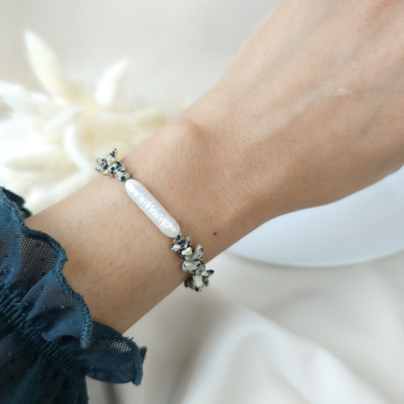 Le Joséphine est un bracelet au caractère affirmé, pensé pour celles qui aiment les bijoux expressifs, contrastés et naturellement élégants. Il est composé de perles chips en jaspe dalmatien, une pierre reconnaissable entre toutes grâce à son motif tacheté, à la fois graphique et profondément organique.