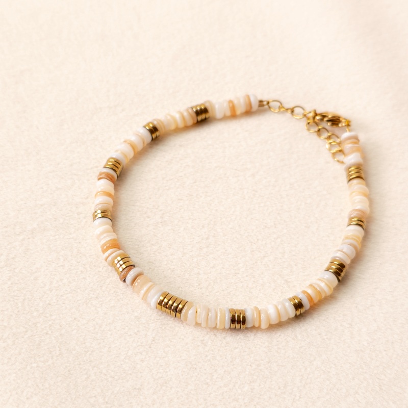 Le Laurena est un bracelet délicat et lumineux, composé de perles heishi en nacre naturelle, lisses et légèrement irisées.