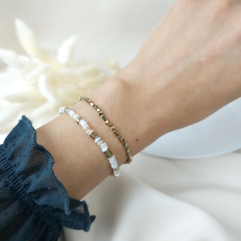 Des hématites dorées viennent ponctuer la composition, créant un contraste subtil et chic avec la nacre. L’ensemble est moderne et d’une grande délicatesse, parfait pour celles qui aiment les bijoux lumineux et intemporels.