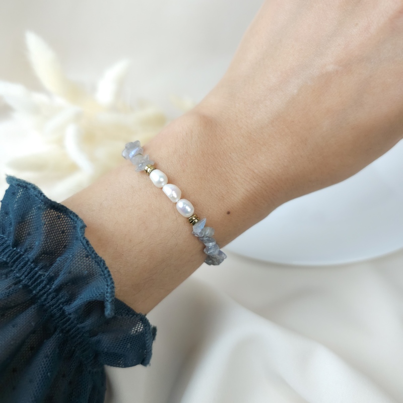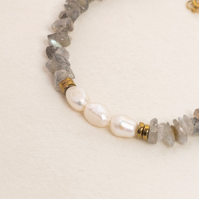 Le Marthe est un bracelet subtil et profond, pensé pour celles qui aiment les bijoux naturels, élégants et empreints de sensibilité. Il est composé de perles chips en labradorite, une pierre aux reflets changeants, oscillant entre gris doux, bleu fumé et touches iridescentes.