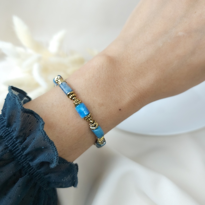 Le Nettie Bleue est un bracelet lumineux et affirmé, composé de perles d’apatites bleue, une pierre vibrante dont les nuances oscillent entre bleu profond et bleu lagon.