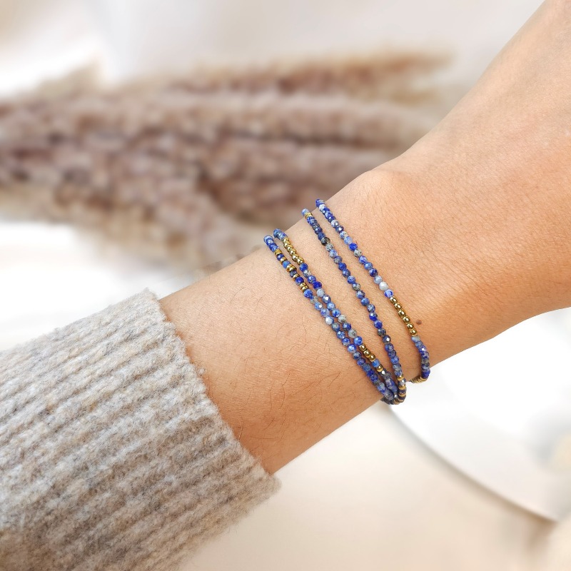 La lapis-lazuli, pierre d’un bleu profond, symbolise la sagesse et l’élégance intemporelle. Associé aux hématites dorées, il offre un contraste raffiné et lumineux.