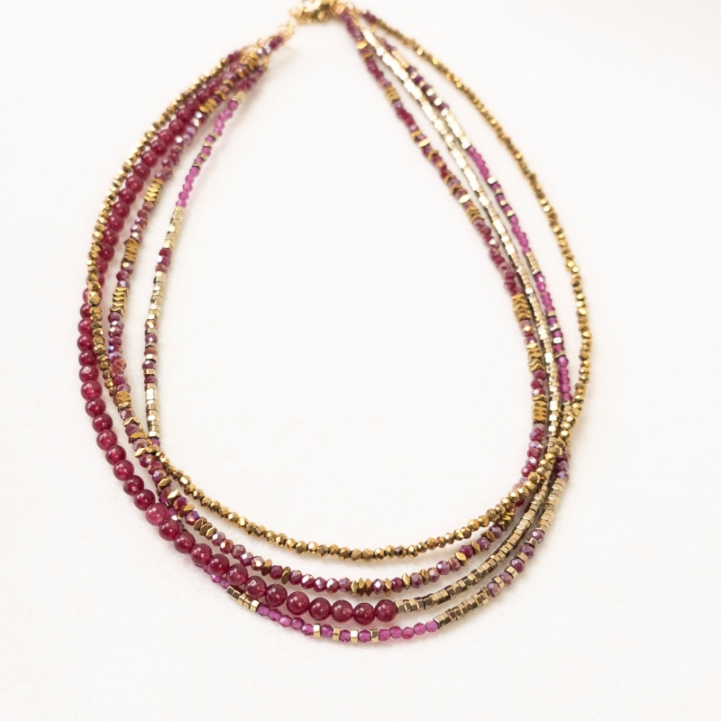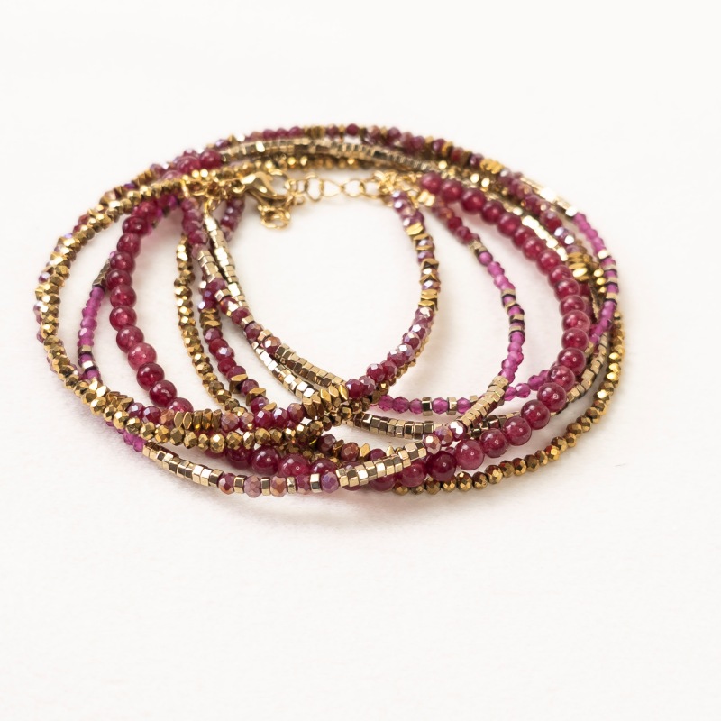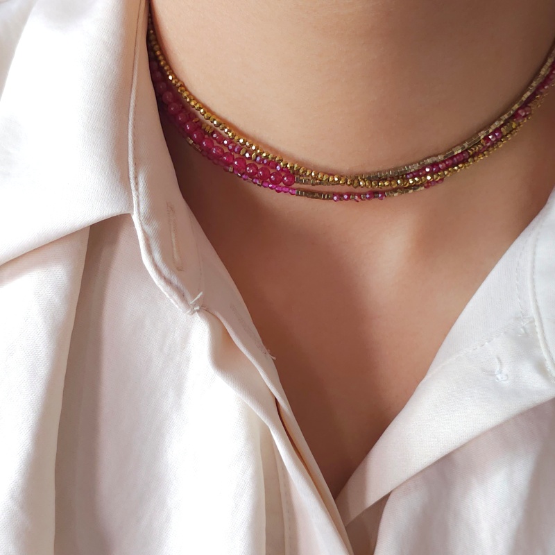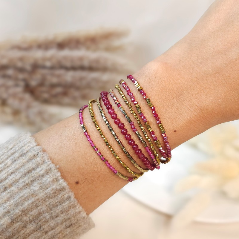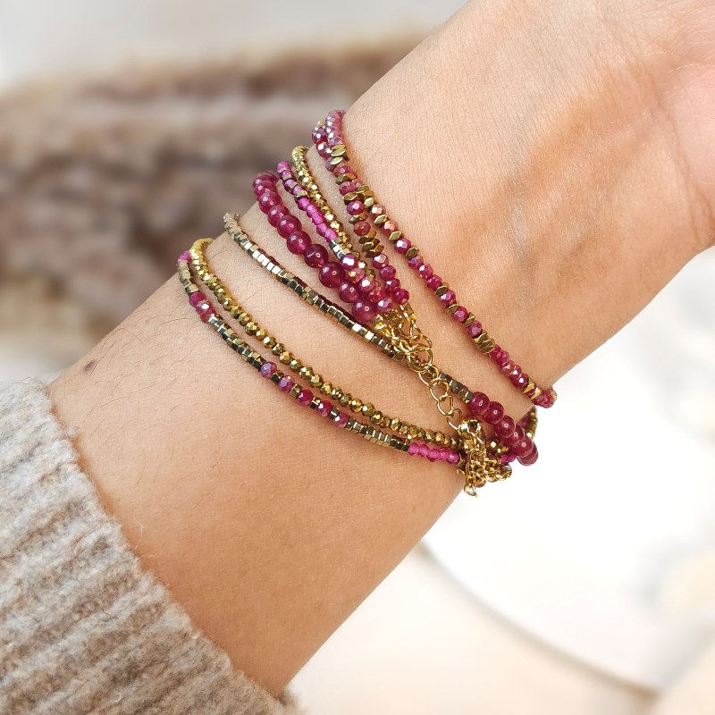 Ses perles en jade teintée rouge grenadine, en verre facetté framboise, rose irisé et doré, associées aux hématites dorées, créent une palette chaude et lumineuse inspirée de l’univers Bollywood : couleurs profondes, éclat sensuel, énergie solaire.