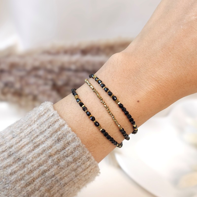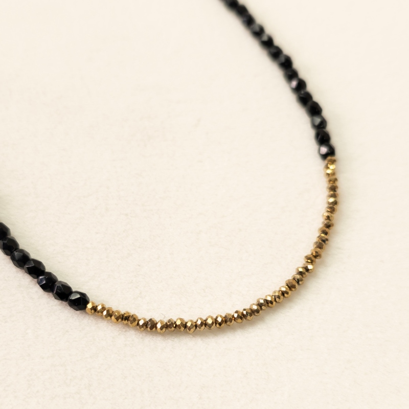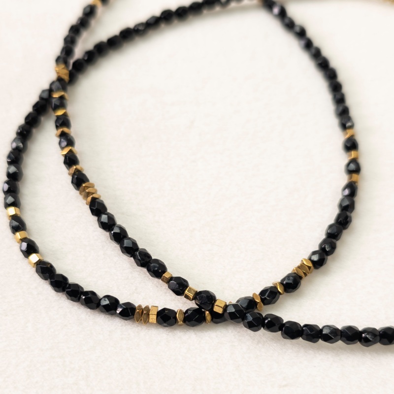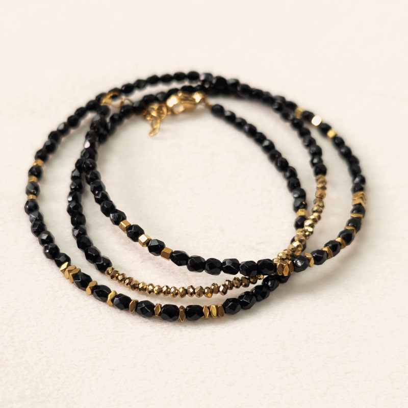 Composé de facettes de Bohème noires et d’hématites dorées, il joue sur le contraste entre profondeur et lumière. Le noir apporte une intensité chic, tandis que les les reflets dorés ajoutent une touche précieuse et moderne.