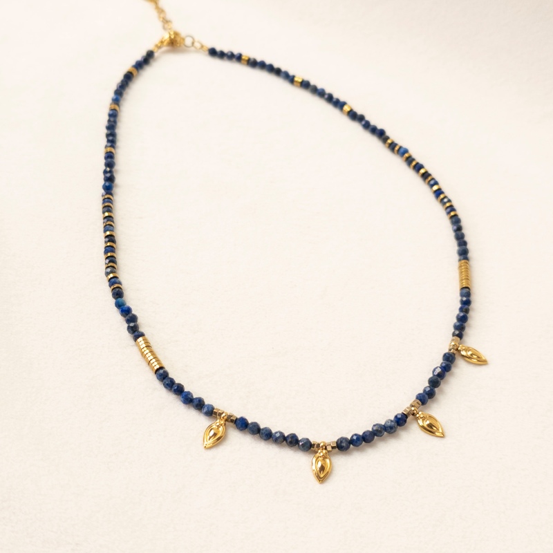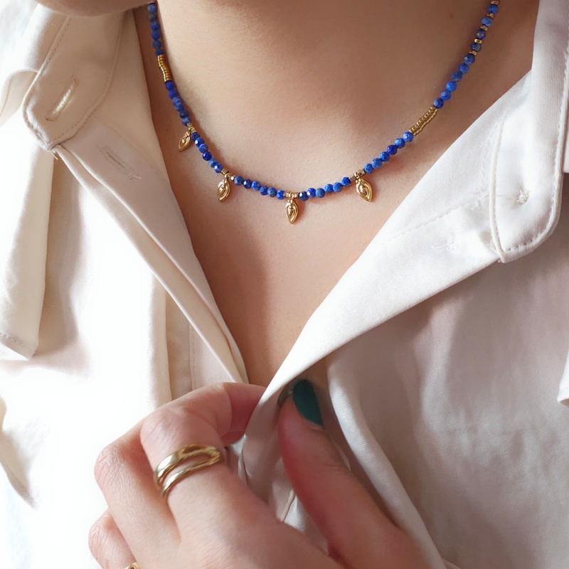 Il est composé de pierres naturelles de Lapis-lazuli, une gemme profonde et royale, reconnaissable à son bleu intense ponctué de nuances dorées. Chaque perle évoque un fragment de ciel nocturne, offrant au collier une présence à la fois mystique et raffinée.