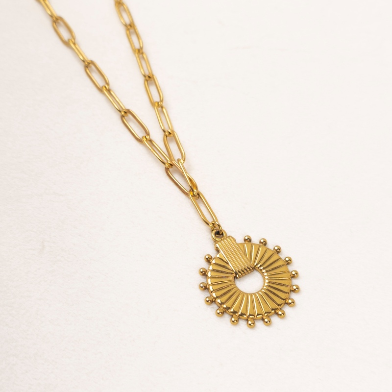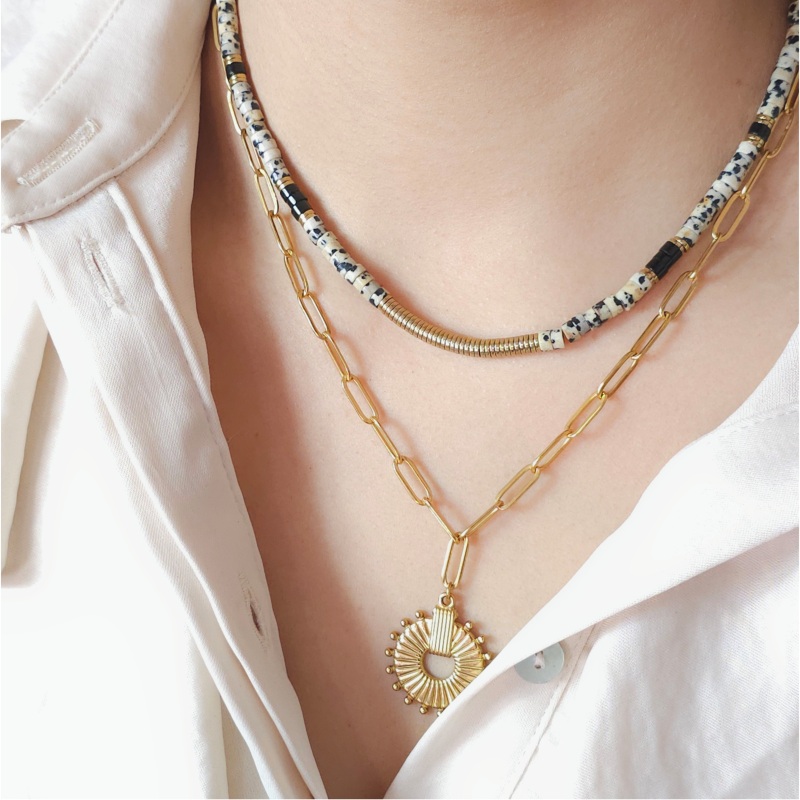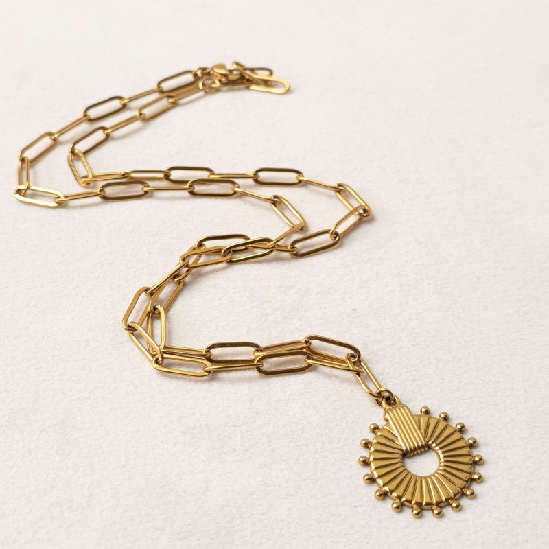 Sa chaîne dorée en acier inoxydable capte la lumière avec subtilité et accompagne le mouvement du corps avec grâce.