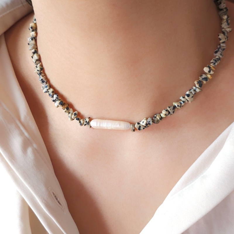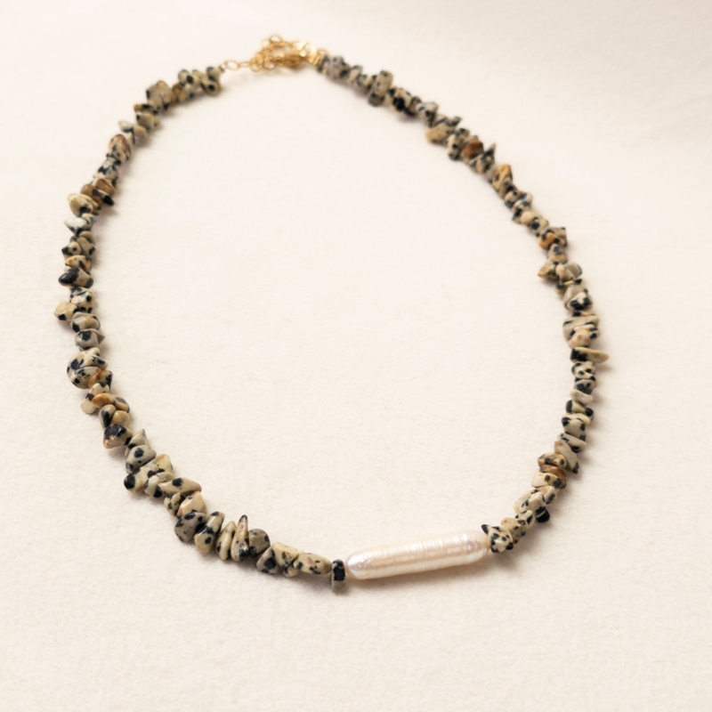 Matières : jaspe dalmatien, perle d’eau douce