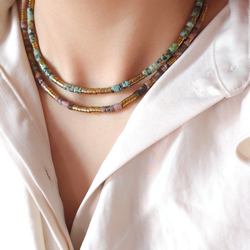 Les bijoux étant entièrement faits main avec des perles naturelles, de légères variations de couleurs et de formes peuvent apparaître – c’est ce qui rend chaque pièce unique.